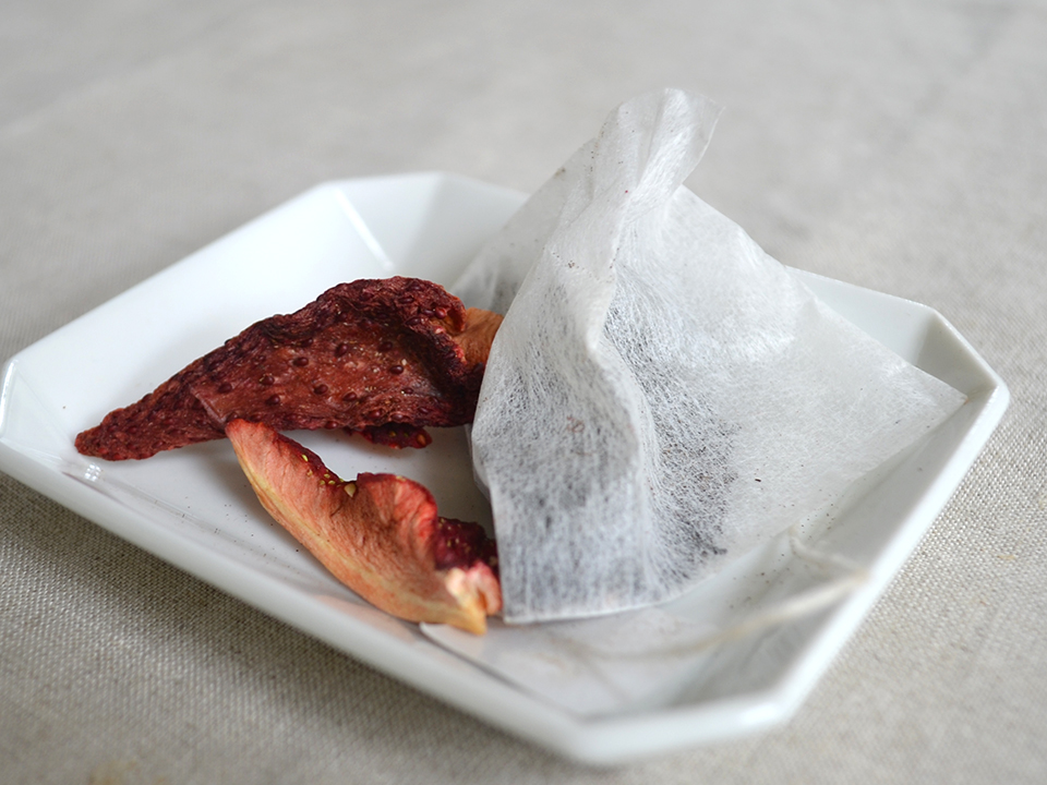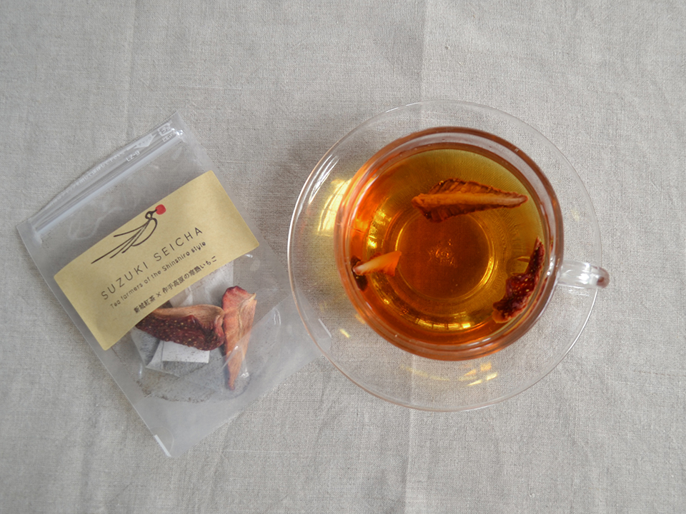 当園の紅茶と、新城市の作手(つくで)高原にある【ファームトヨヒロ】さんの「寒熟いちご」とのコラボレーションです。しっかりと熟したいちごをセミドライにして、柔らかい味わいの、「さやまかおり」の紅茶ティーバッグとともにパッケージ。凝縮されたいちごの甘みやさわやかな酸味で、華やかな味わいの紅茶が楽しめます。12月~3月まで冬季限定販売です。